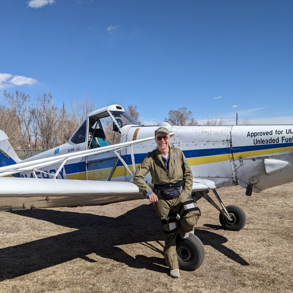 Many of the more interesting new aircraft are actually what’s called colloquially “home-built”. Some are one-off designs, but more are built from kits. This kit-built bird is a “Kolb Mark III Extra”. The new owner bought it from the builder and wanted transition training for it. It’s a fascinating bird to fly, quite noisy, and in the winter in Colorado, can be very cold. But in pleasant weather, and wearing suitable clothing, she’s great fun. Her power to weight ratio is excellent, and she climbs very fast. However, her design is quite draggy and she doesn’t fly particularly fast. But that’s OK; she affords excellent views of the ground, and because she’s fairly slow, the landing roll is very short. The combination means that she’s safe to fly “low and slow” enjoying the unique viewpoint that only an aircraft can give. As is so often the case when two people share the very special experiences afforded by both sailing and flying, the owner and I have since become firm friends too.
